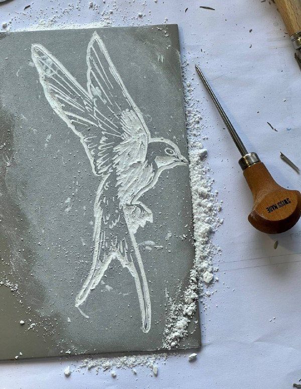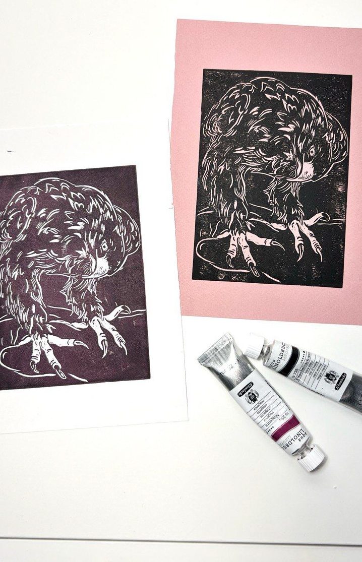 Heute arbeite ich besonders gern mit Drucktechniken wie dem Linolschnitt und beschäftige mich auch mit Radierung. Außerdem interessiere ich mich für verschiedene Formen kreativer Handarbeit – von Druckgrafik bis zur Umgestaltung von Möbeln.